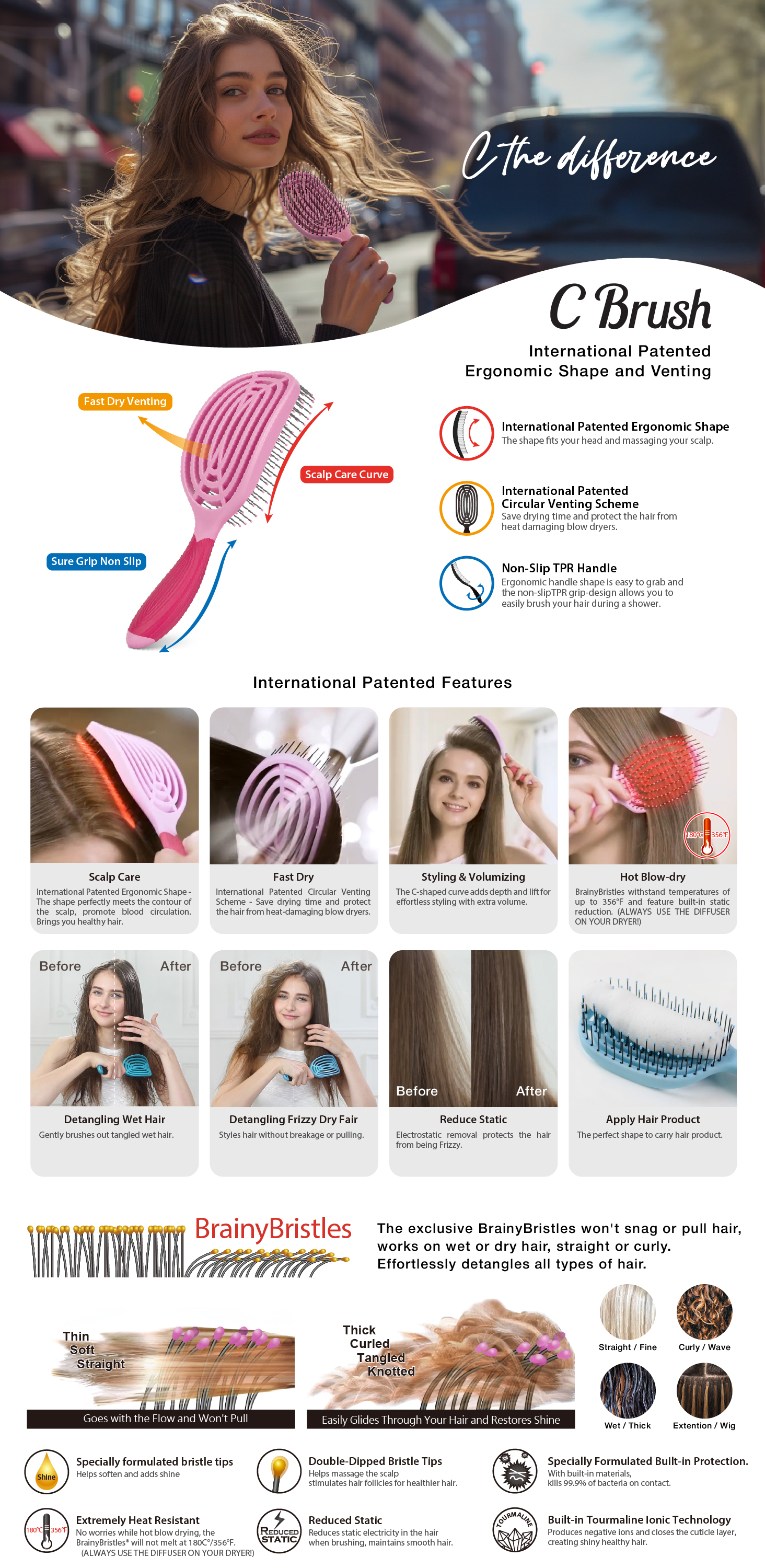 International patented Ergonomic C Shape fits and massages your scalp, bringing you healthy shiny hai