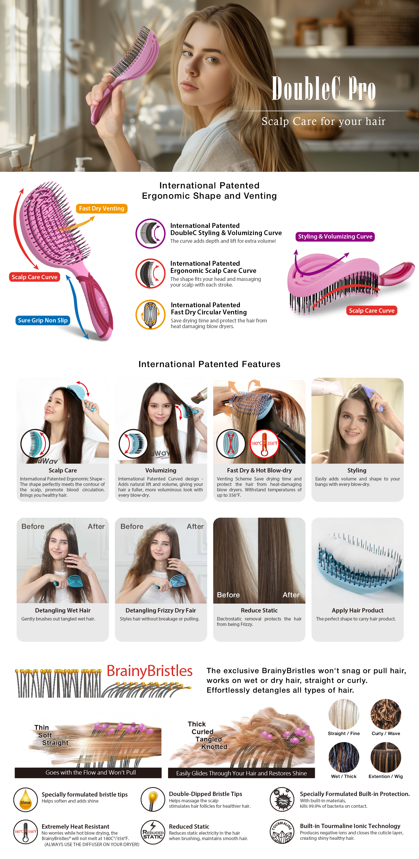 The exclusive BrainyBristles won't snag or pull hair, works on wet or dry hair, straight or curly.