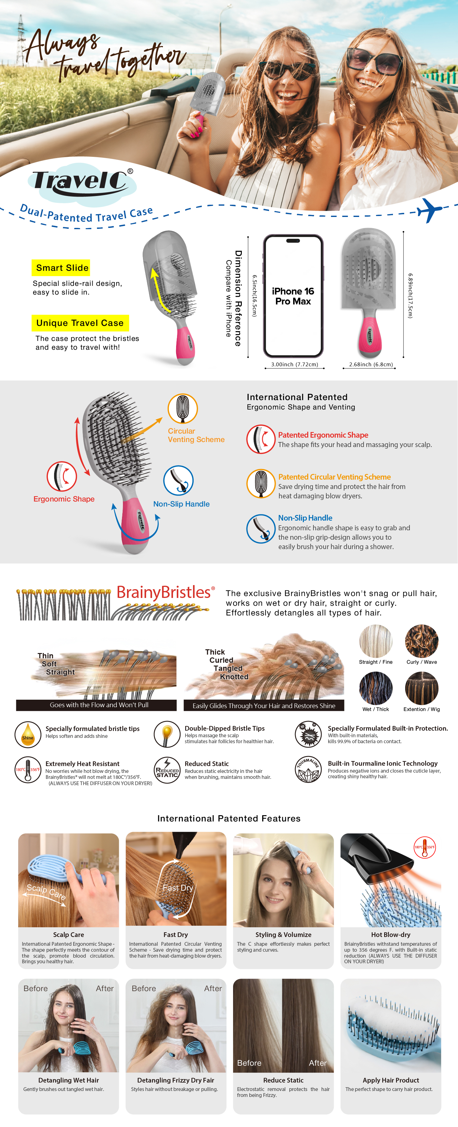 The exclusive BrainyBristles won't snag or pull hair, work on wet or dry hair, straight or curly.