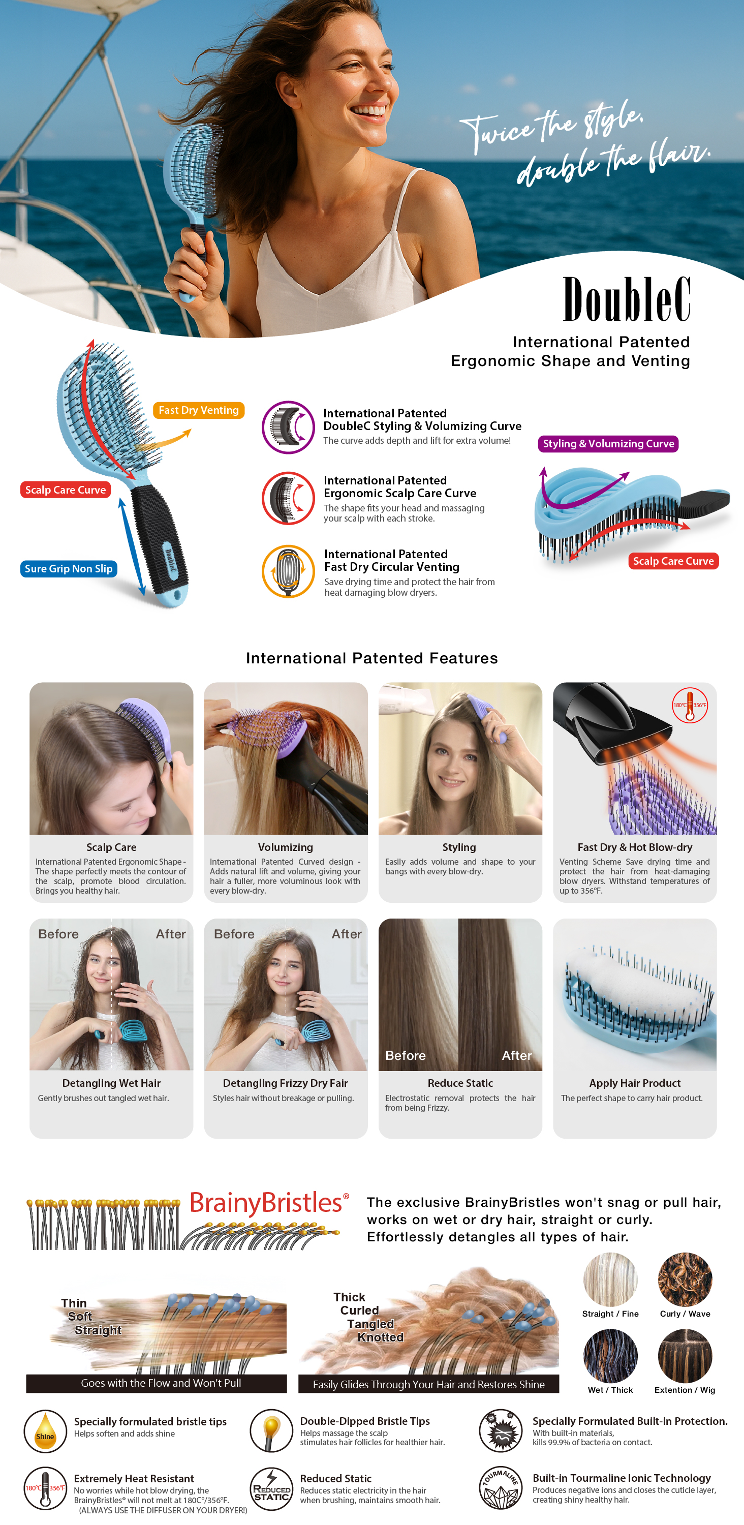 The exclusive BrainyBristles won't snag or pull hair, works on wet or dry hair, straight or curly.