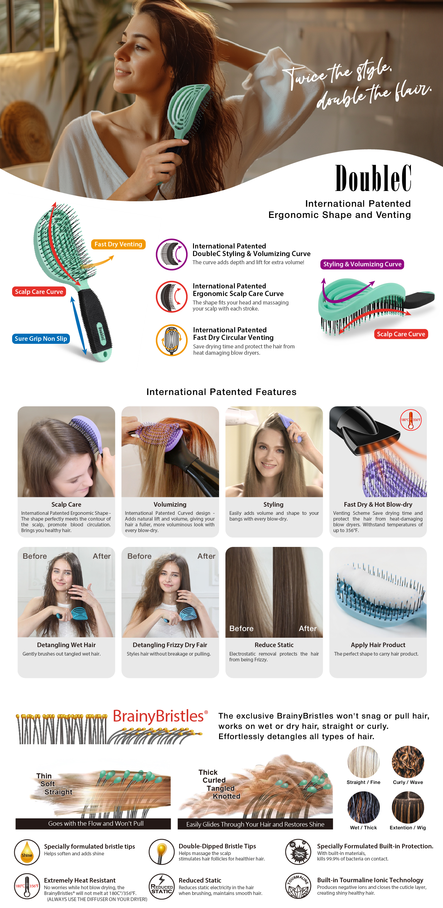 The exclusive BrainyBristles won't snag or pull hair, works on wet or dry hair, straight or curly.