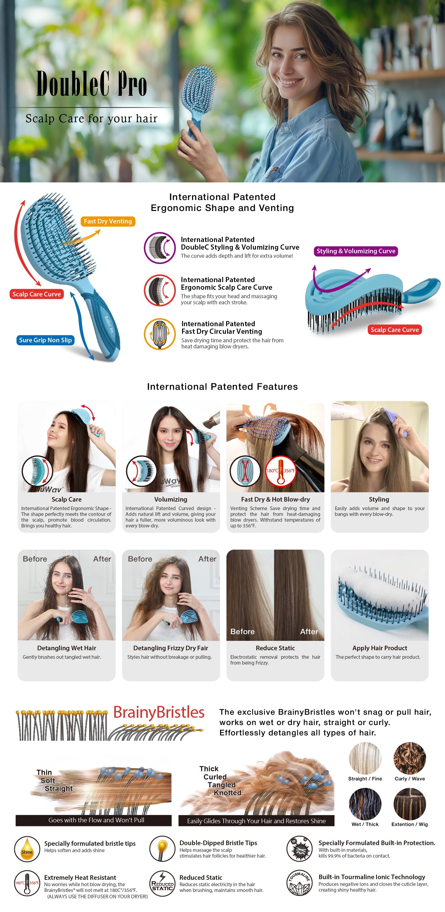 The exclusive BrainyBristles won't snag or pull hair, works on wet or dry hair, straight or curly.