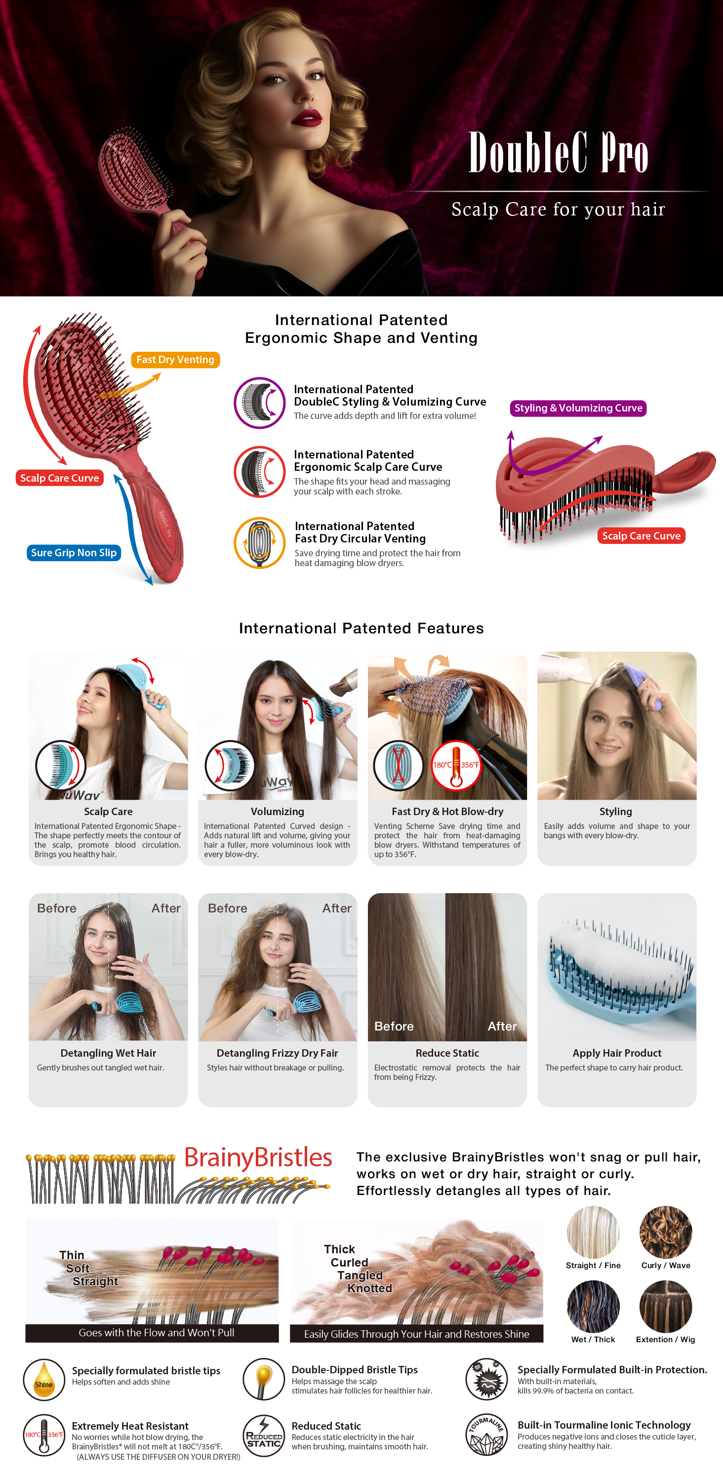 International patented Ergonomic C Shape fits and massages your scalp.